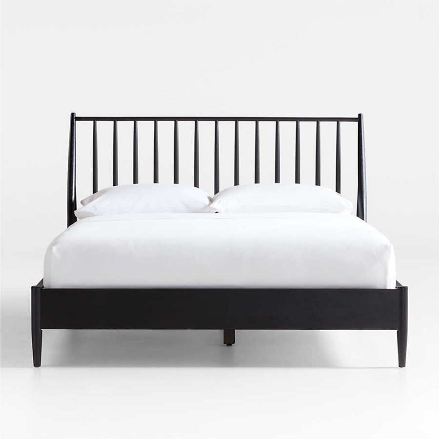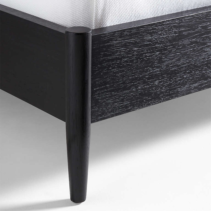 Turned legs and a spindled headboard nod to tradition while clean lines and interesting angles give our Carson bed a decidedly contemporary air. Sleek rails draw the eye to the linear headboard formed by angled legs intersecting with back-tilting supports to frame a row of slender spindles. Made of sustainably Acacia hardwood, the bed shows off the wood grain with wirebrushing and a black ebonized finish. Intriguing from all sides, our exclusive Carson bed can be positioned in any way to best suit your bedroom decor.